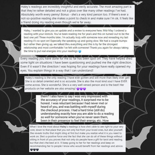 I found a passion for tarot over five years ago and have been reading for others ever since. My approach to tarot is intuitive and I'm not here to sugar coat anything. I take pride in giving authentic and honest readings to my clients. I won't tell you what you want to hear - but what you need to hear.