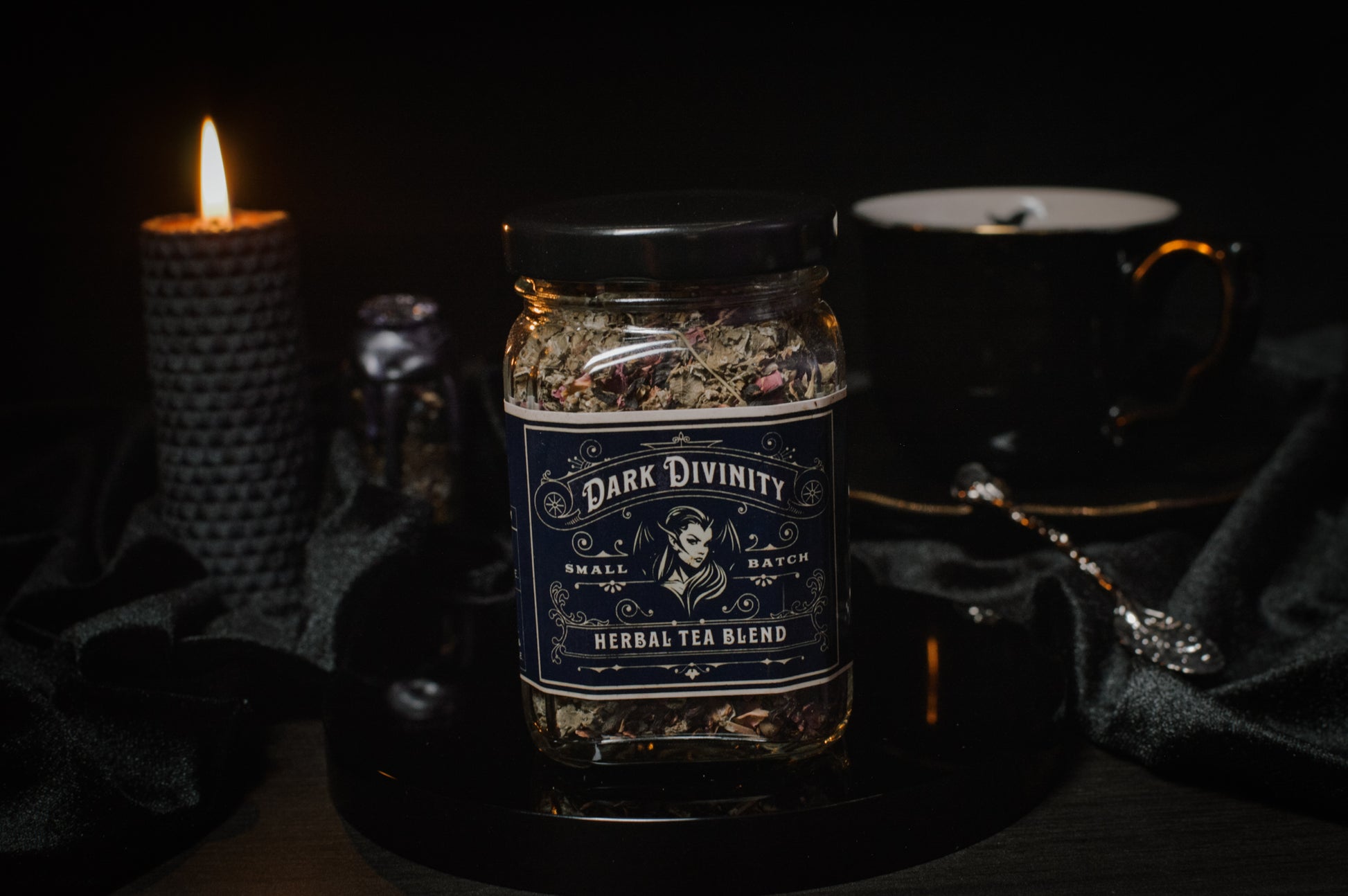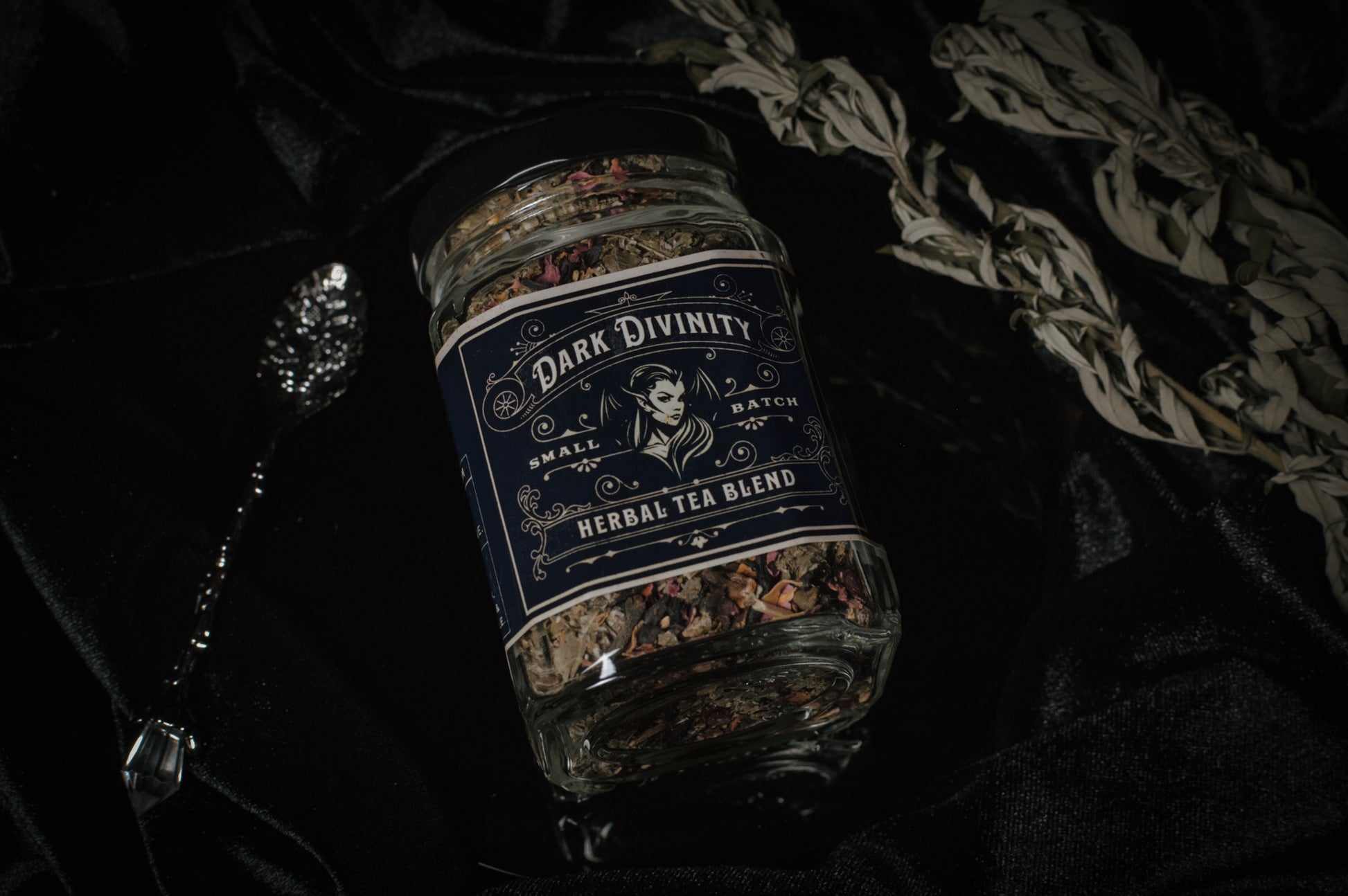 Dark Divinity is a blend of red raspberry leaf, hibiscus, rose, and clove that has been carefully concocted in small batches.