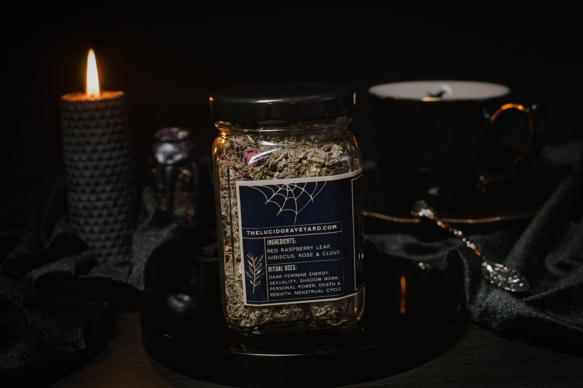Embrace your inner darkness with this tea and enhance your dark feminine energy, increase your personal power, and even explore the depths of shadow work. With it's intuitive blend of ingredients, Dark Divinity Tea can also bring death and rebirth energy to your life and is perfect for menstrual cycle rituals and enhancing sexuality.
