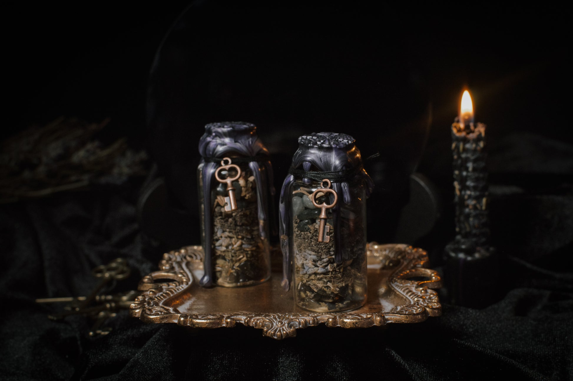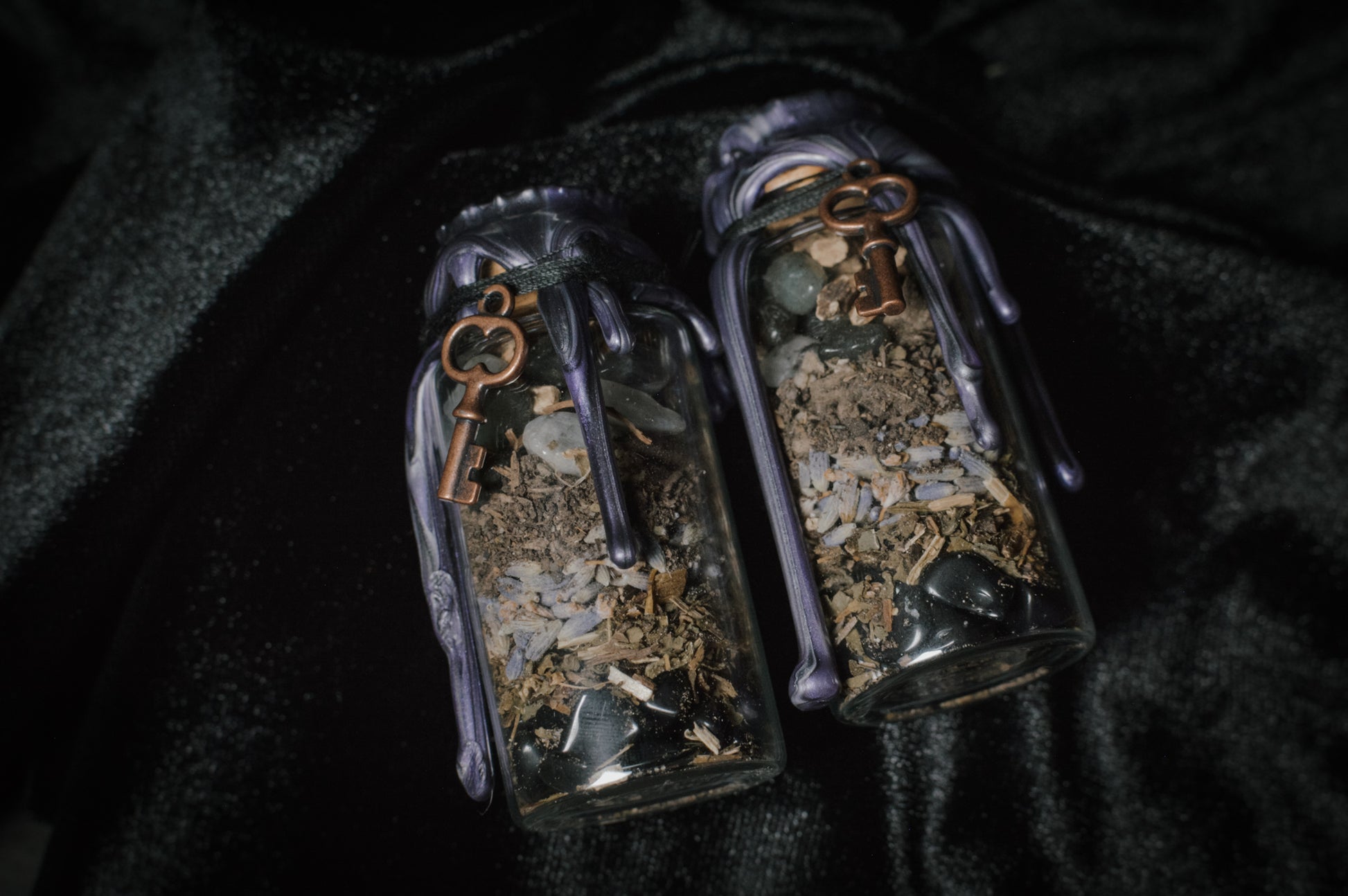 The bottle contains an intuitive blend of black obsidian, comfrey leaf, lavender, graveyard dirt, labradorite, and mandrake—each chosen for its connection to protection, transformation, and deep magickal work.
