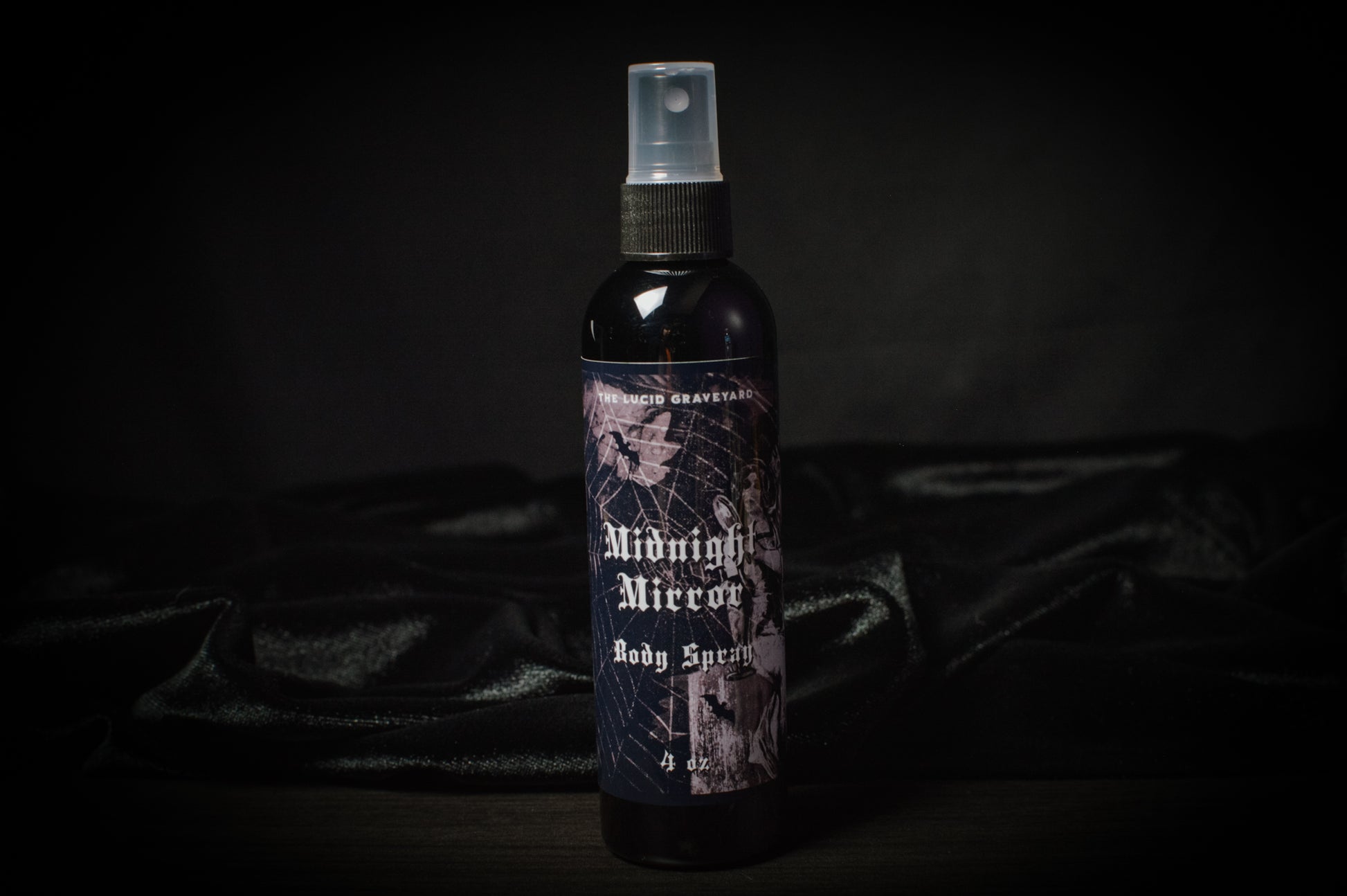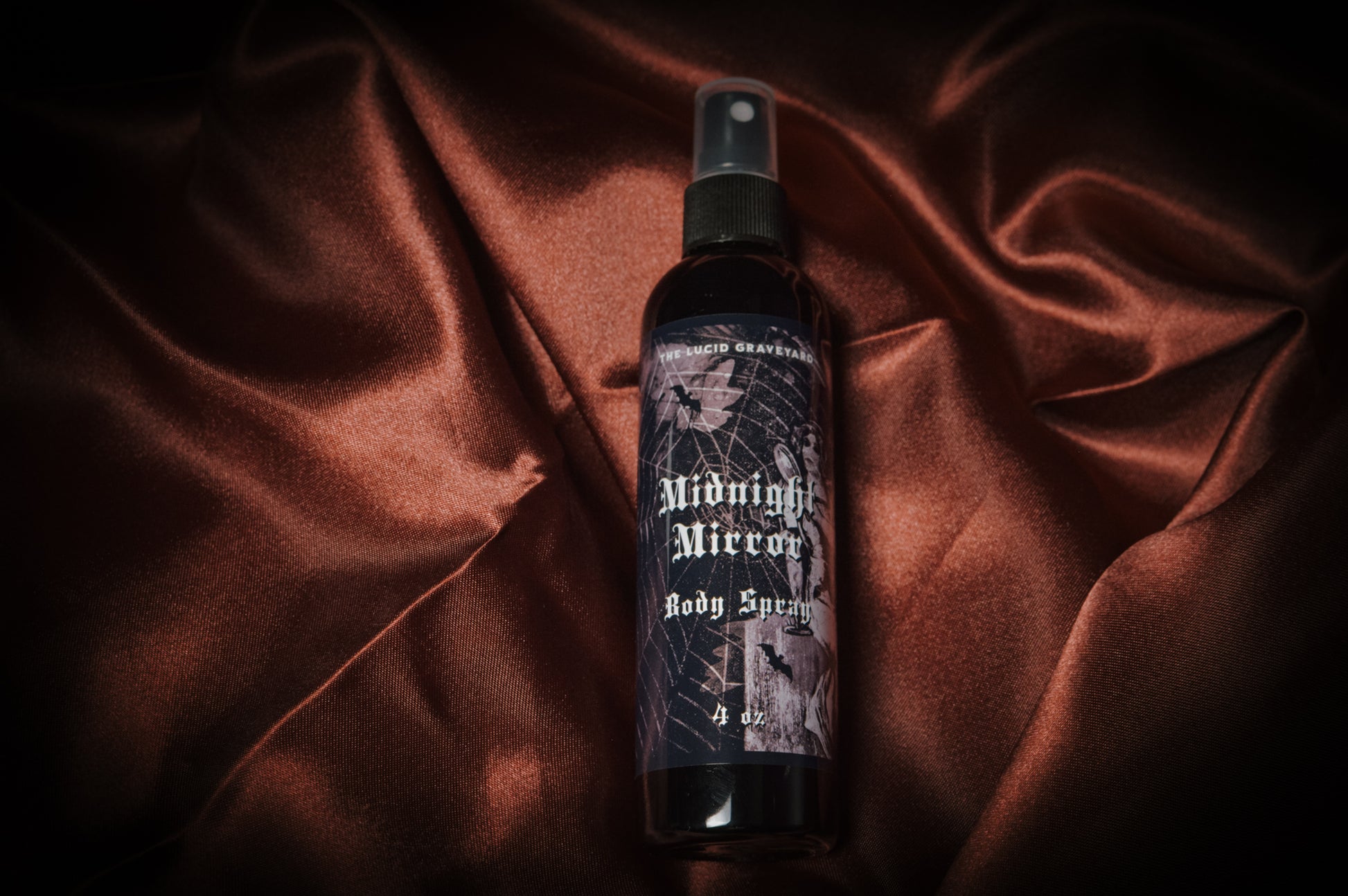 Our Midnight Mirror body spray is inspired by the Victorian-era parlor game that one would perform on Halloween Night. It was said that you would see your future partner or a haunting skeleton when looking into a mirror at midnight.